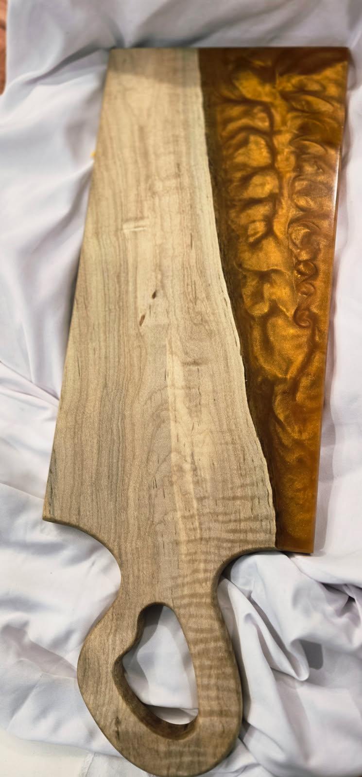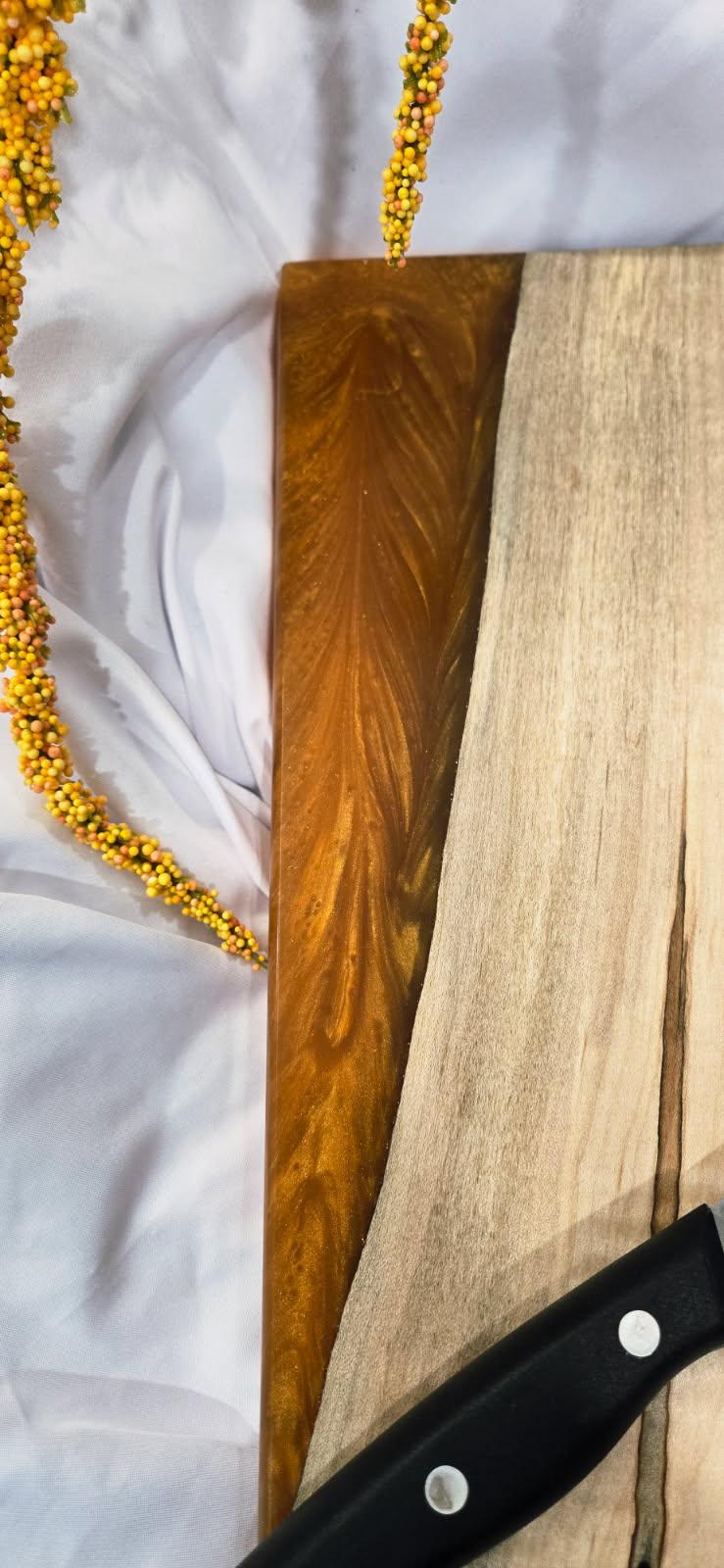 Introducing our Maple Orange Epoxy Serving Board - a stunning combination of natural wood and vibrant color. Crafted with high-quality materials, this board is perfect for serving appetizers or charcuterie. Its durable design ensures long-lasting use, while the eye-catching design adds a touch of elegance to any occasion. Elevate your entertaining experience with this unique serving board.